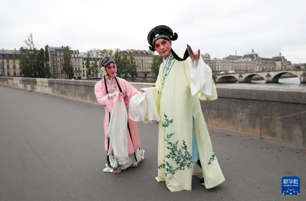 9月13日,江苏省演艺集团昆剧院院长施夏明(右)和江苏省演艺集团昆剧院国家一级演员孔爱萍在法国巴黎塞纳河畔参加昆曲快闪。