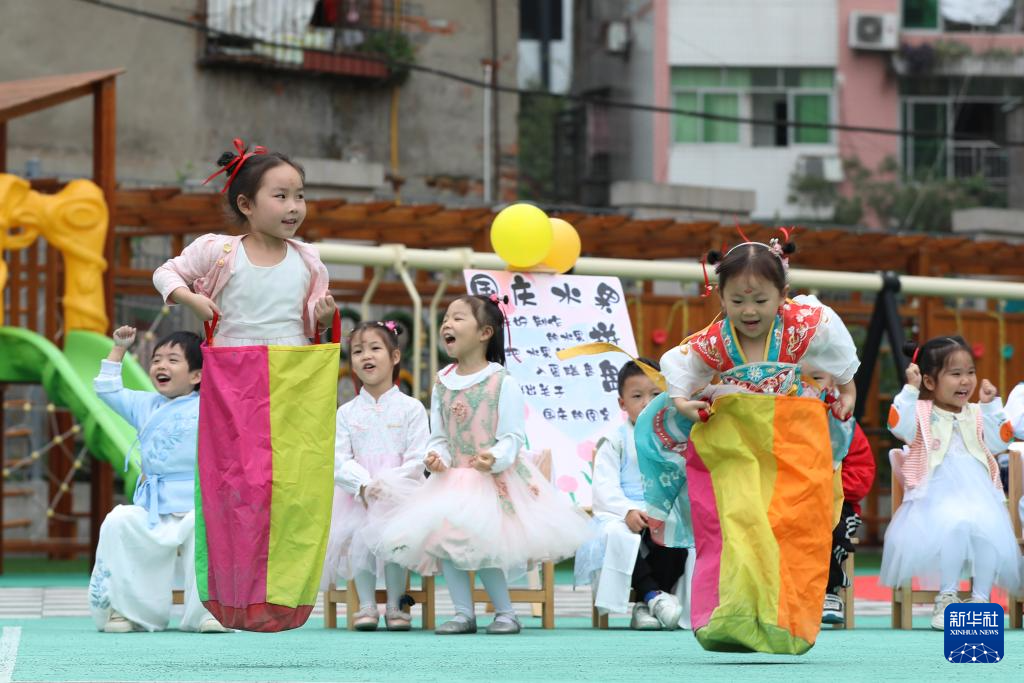 9月27日,四川省广安市武胜县迎宾幼儿园的小朋友穿上跳袋玩“嫦娥奔月”的游戏。