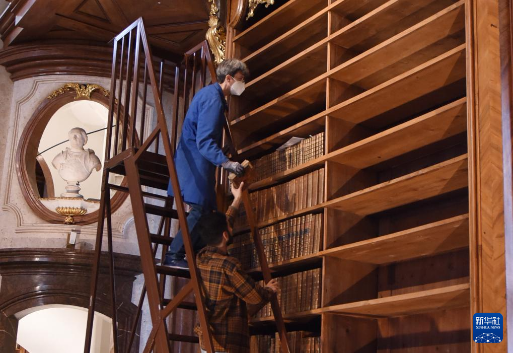 11月7日,工作人员在位于奥地利维也纳的奥地利国家图书馆普隆克厅内整理古籍。