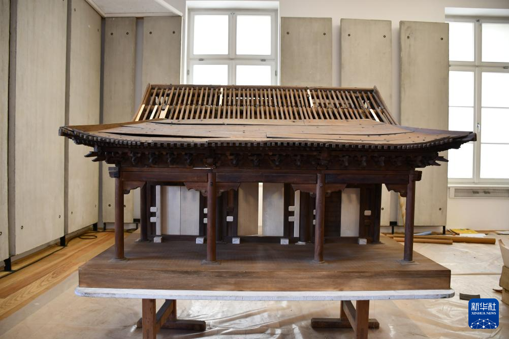 这是11月6日在斯洛文尼亚卢布尔雅那的民族志博物馆拍摄的修复完成的中国古建筑木质大门模型。