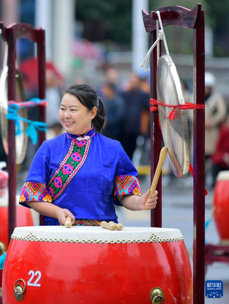 11月11日,在湖北省来凤县城龙凤文化中心广场,鼓手为跳摆手舞的舞者伴奏。