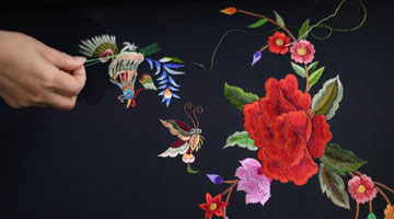 11月16日,在安徽展区,人们在师傅(左)的指导下现场体验宣纸制作。