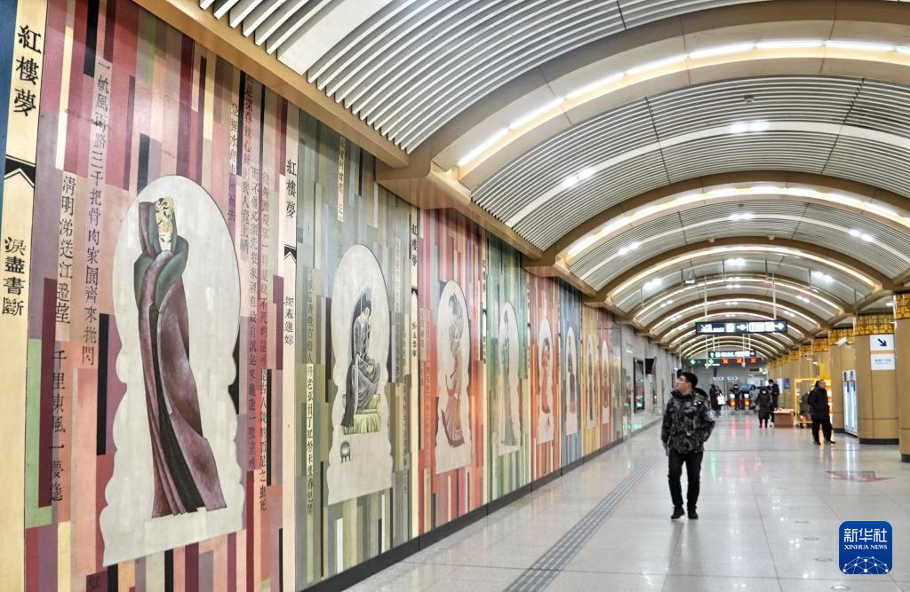 乘客在磁器口地铁站内观看“红楼梦”壁画(1月20日摄)。