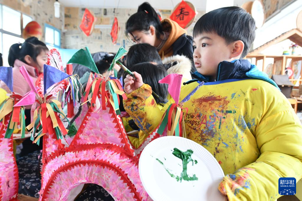 1月29日,浙江省建德市航头中心幼儿园的孩子在老师指导下为“板凳龙”添色。