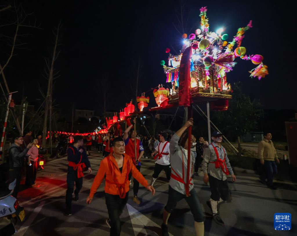 2月19日,在澧浦镇里新村,村民们抬着长长的传统板凳龙在村落中穿行。