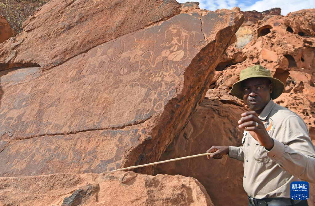 3月26日,在纳米比亚库内内省,导游给游客讲解颓废方丹岩画。
