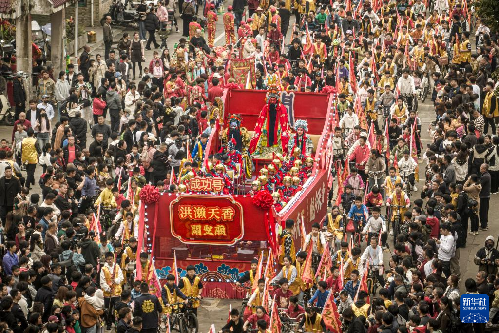 武凌云(中)和团队成员在福建省南安市洪濑镇演出(3月16日摄)。