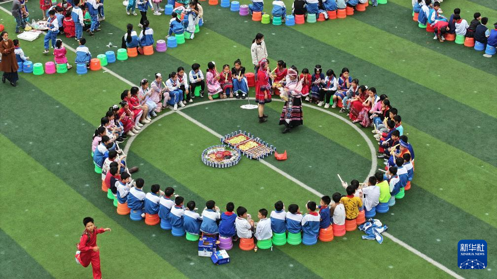 4月10日,老师和孩子们在广西南宁市逸夫小学庆祝“三月三”(无人机照片)。