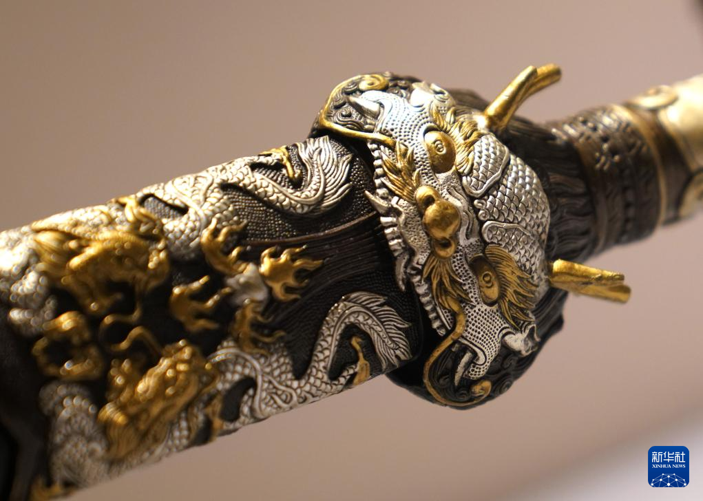 这是展出的一款龙泉宝剑作品局部(5月7日摄)。