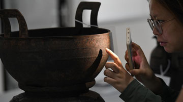 5月17日,游客在位于西安市临潼区的秦始皇帝陵博物院内参观鞍马骑兵俑。