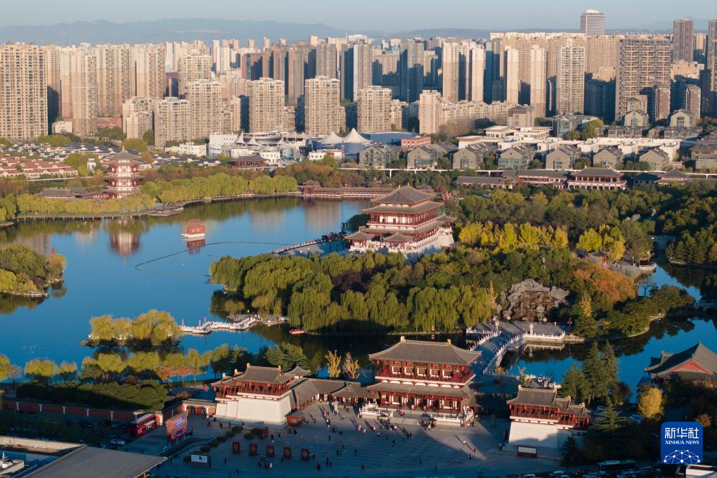 西安市大唐芙蓉园(2023年11月17日摄,无人机照片)。