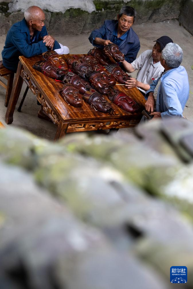 5月16日,在陈家老屋前的院坝,冷定祥(右)手拿阳戏面具与戏搭子研究剧目。