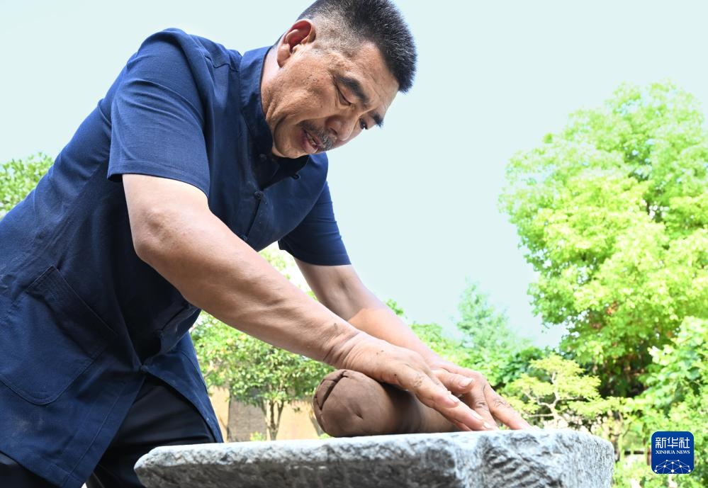 张书芳在香案上揉香泥(7月3日摄)。