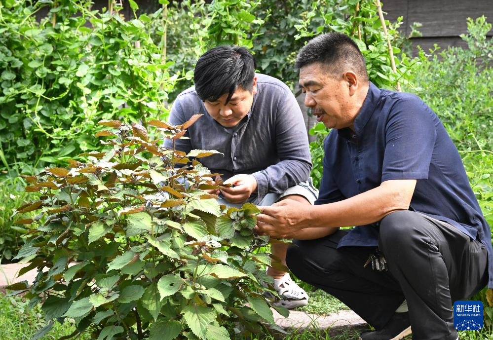 张书芳(右)在中草药种植园教儿子张力分辨中药材,讲解药材的药性(7月3日摄)。