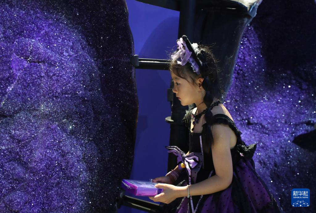 7月16日,一名小朋友在重逾1吨的“巨无霸满天星”晶洞前驻足观看。