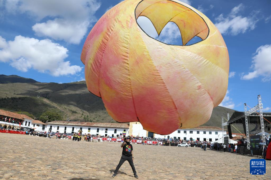 8月17日,在哥伦比亚莱瓦,工作人员向空中飘过的中国龙头风筝挥手。