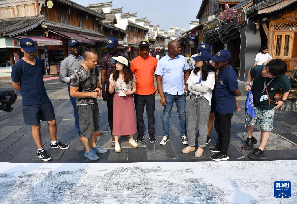 9月3日,在常德河街,外国游客体验非遗麻质画制作。