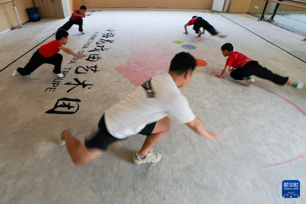 小昆班专职老师周杰在石牌中心小学校训练房内指导学员训练(9月6日摄)。