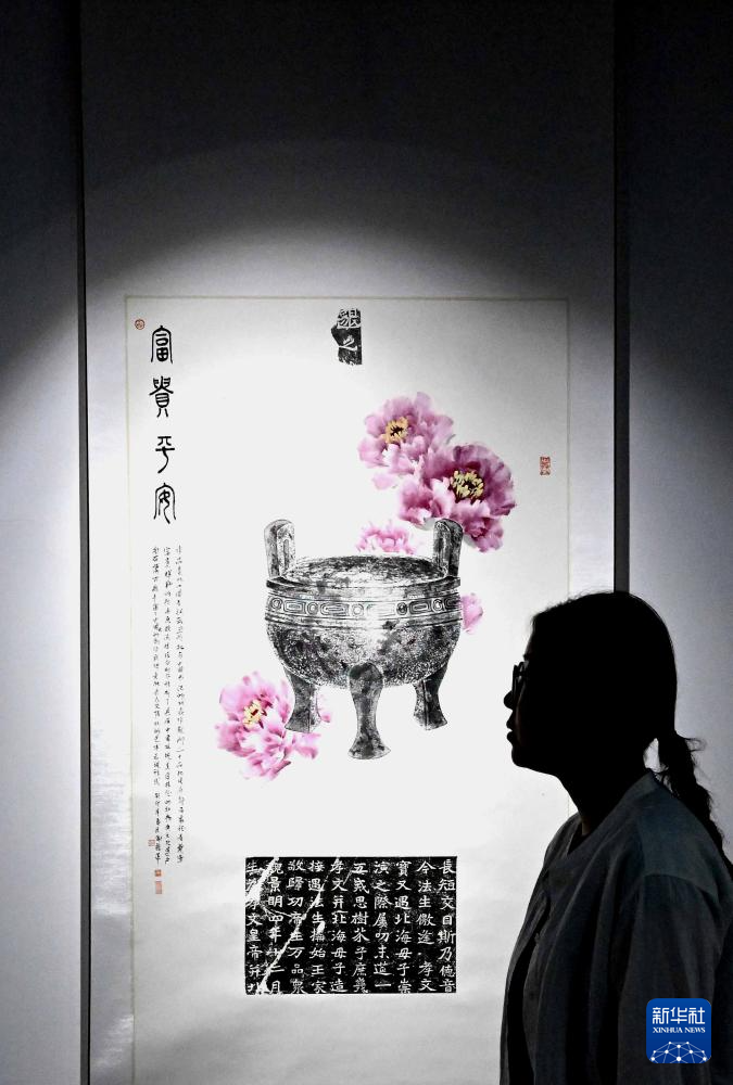 在洛阳华夏金石文化博物馆,钱夏玉在观看金石博古画成品(9月11日摄)。