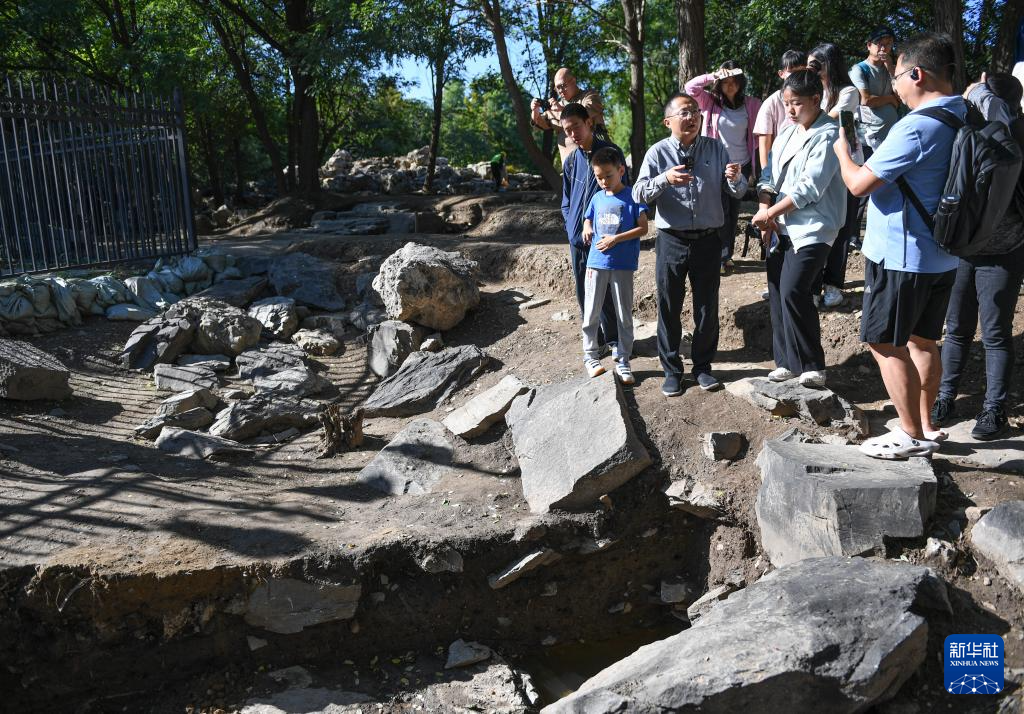9月22日,北京市考古研究院工作人员向活动参与者介绍文源阁遗址的河道遗迹。
