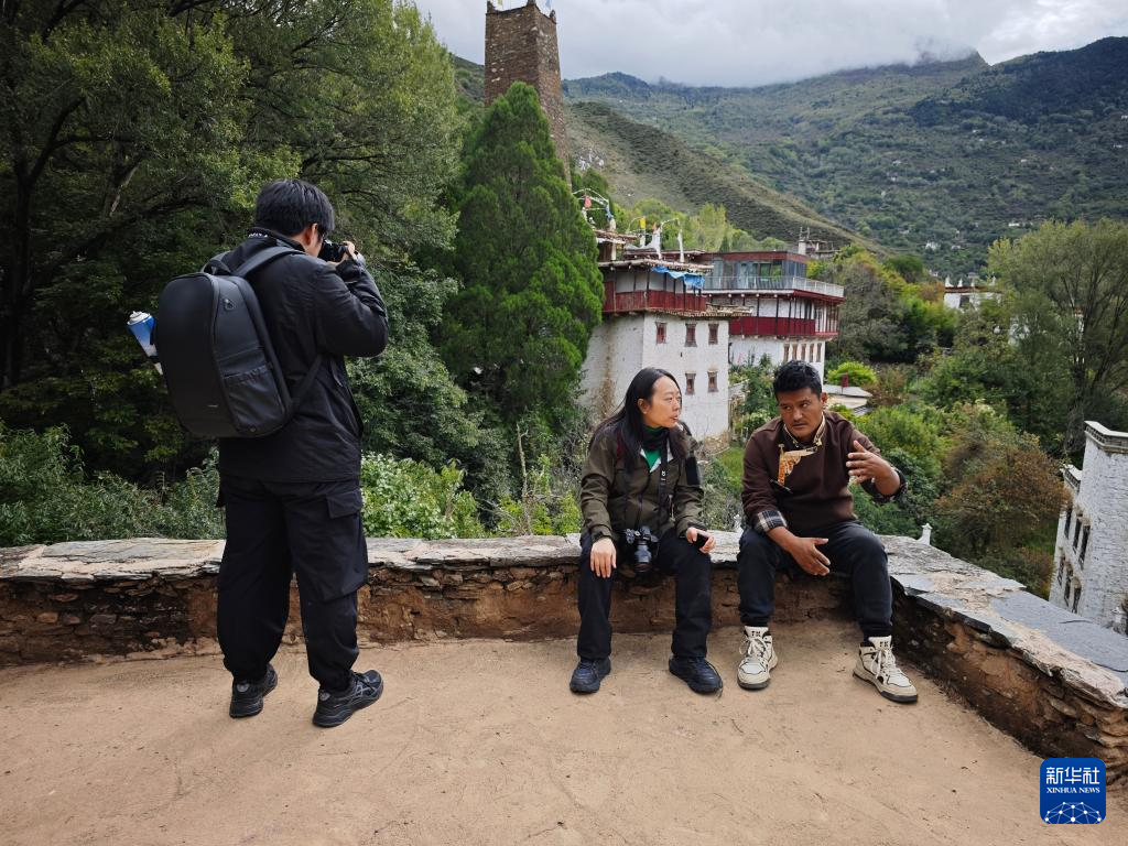 10月11日,川影师生在丹巴县采访藏族碉楼主人翁都(右)。
