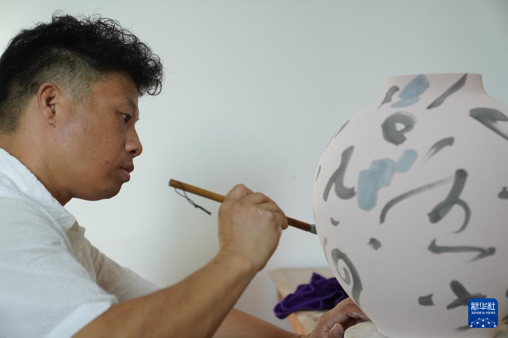 46岁的尹志军是江西陶瓷工艺美术职业技术学院教师,也是景德镇陶瓷书法非物质文化遗产代表性传承人。他将文字笔画拆解,结合色彩、设计和绘画,形成了自己独特的艺术风格。如今,尹志军创作的陶瓷书法作品已融入茶具、家居、装饰等生活用品和工艺品中,深受年轻人喜爱,作品也先后被中国工艺美术馆、江西省博物馆等收藏。