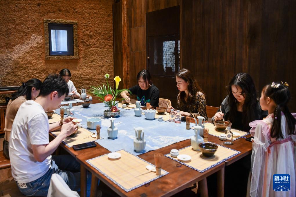 游客在长守戏剧谷里体验制作抹茶(11月9日摄)。