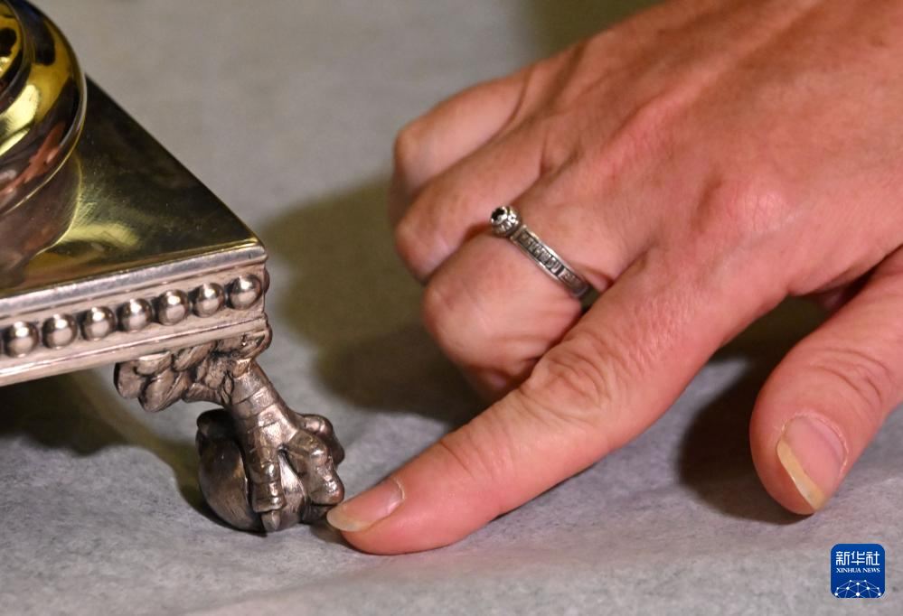 这是即将展出的船形杯局部(11月13日摄)。船形杯是古代俄罗斯最具特色的容器之一。在宴会上,船形杯被用来盛放最受欢迎的俄罗斯饮料——蜂蜜或蜂蜜酒。