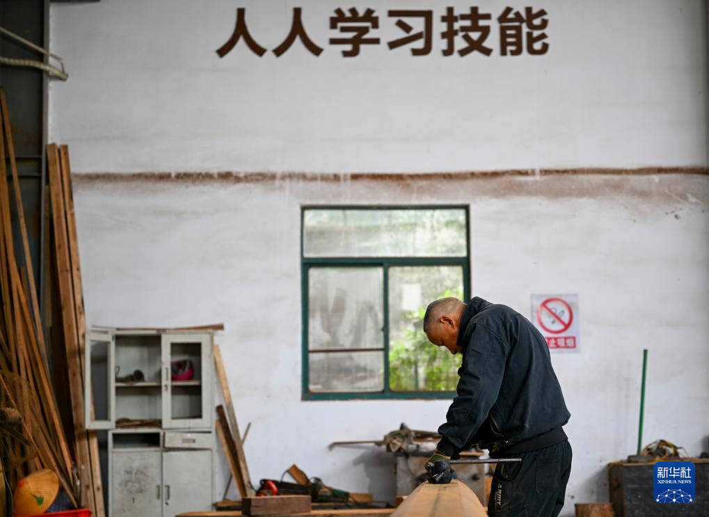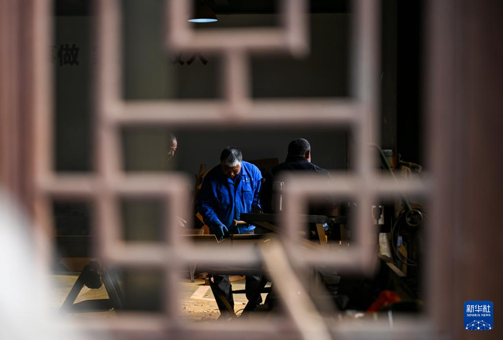 11月22日,在“古建共富工坊”,木工师傅在给木材划线。