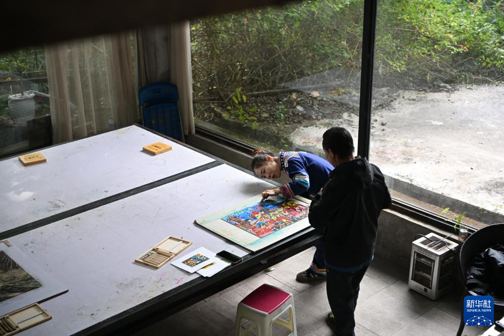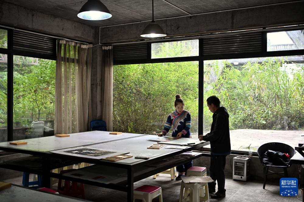 12月9日,在云南普洱学院那柯里绝版木刻教学实践基地,绝版木刻画师在交流版画制作。