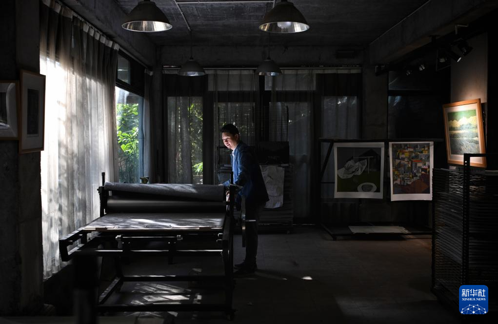 12月9日,在云南普洱学院那柯里绝版木刻教学实践基地,基地负责人、绝版木刻画家冷光冕在印制版画。