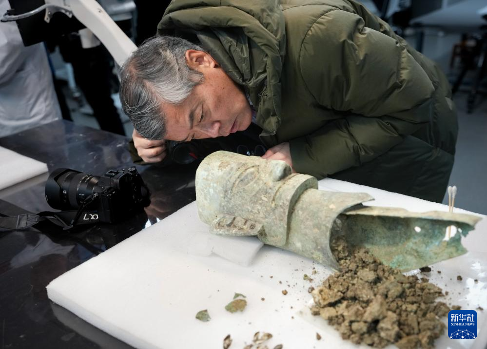 12月16日,在三星堆研究院,考古专家在仔细查看一件青铜面具。