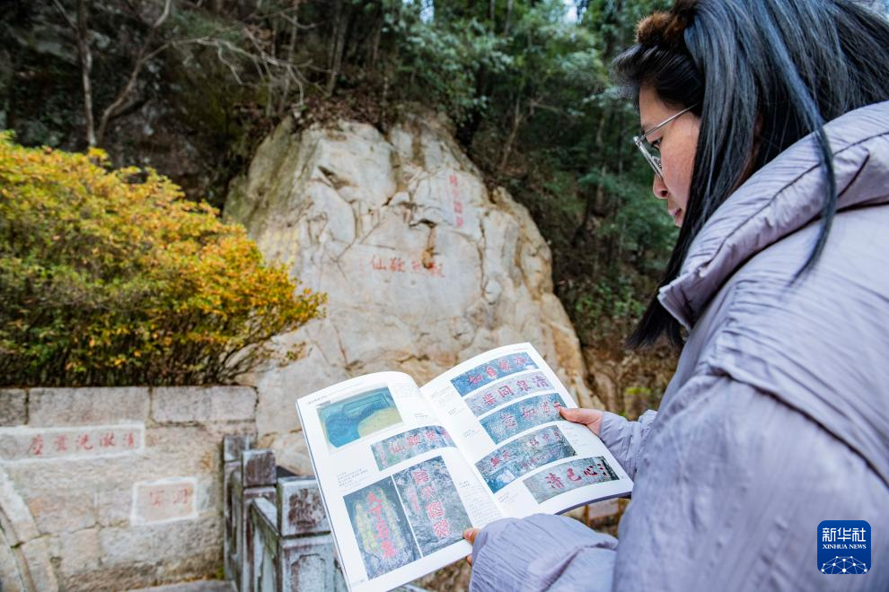12月18日,黄山风景区文化事业管理办公室工作人员章静茹对照《黄山摩崖石刻》书籍查看摩崖石刻。