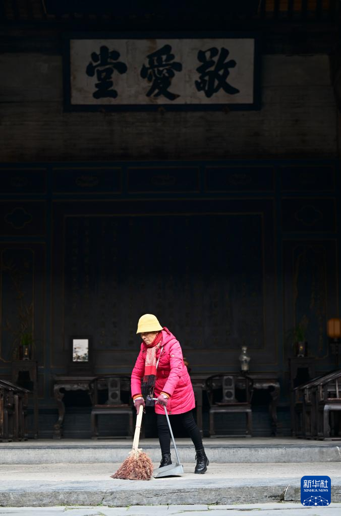 12月18日,胡晓雯在西递村敬爱堂中打扫卫生。