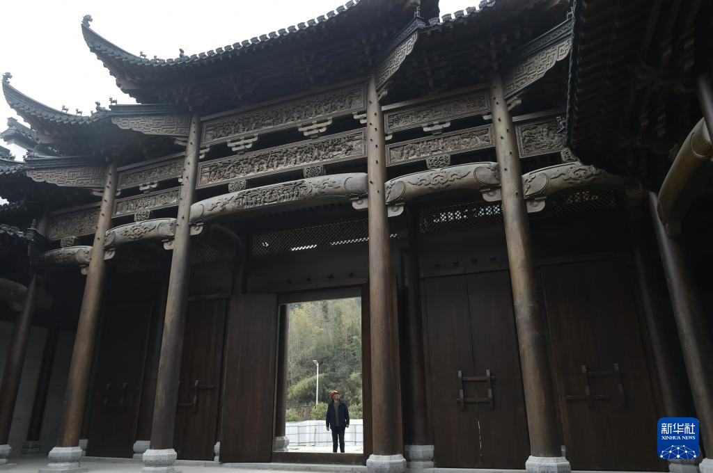 1月8日,在安徽省黄山市休宁县,工人在一处传统徽派古民居复建工地现场进行木料加工。