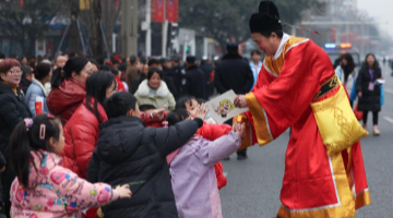 1月22日,在绵竹年画节开幕式上,踩着高跷的演员与群众互动。
