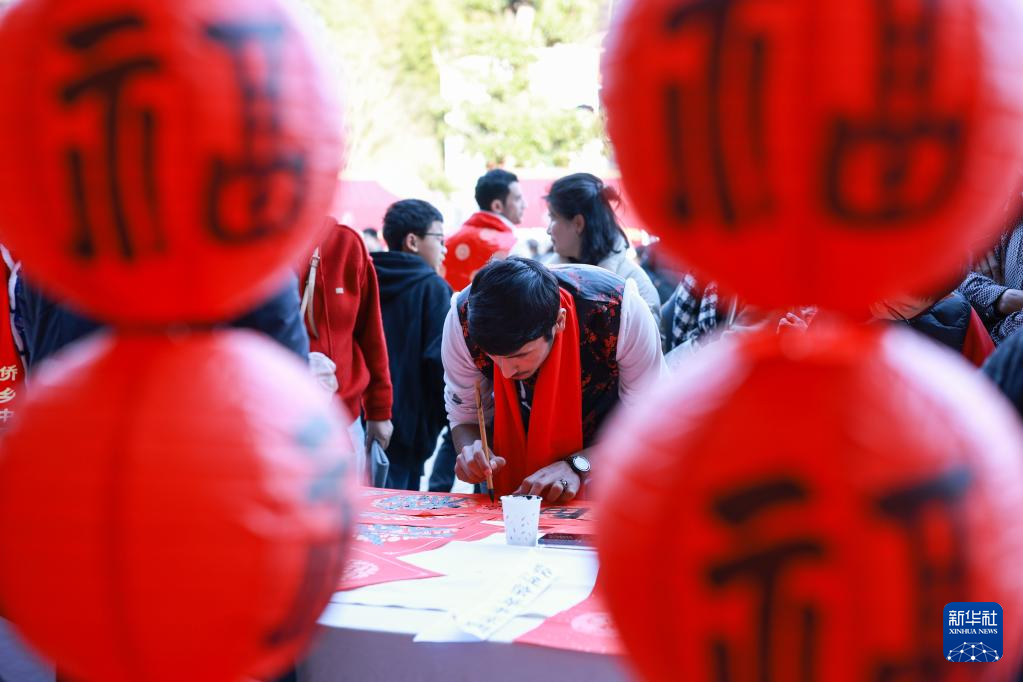 1月23日,在浙江省丽水市青田县方山乡举行的2025浙江侨乡中国年活动上,外国友人现场写福字。
