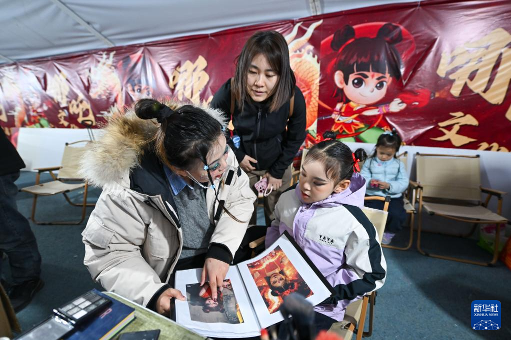 小朋友在天津哪吒小镇挑选哪吒造型头饰(3月16日摄)。