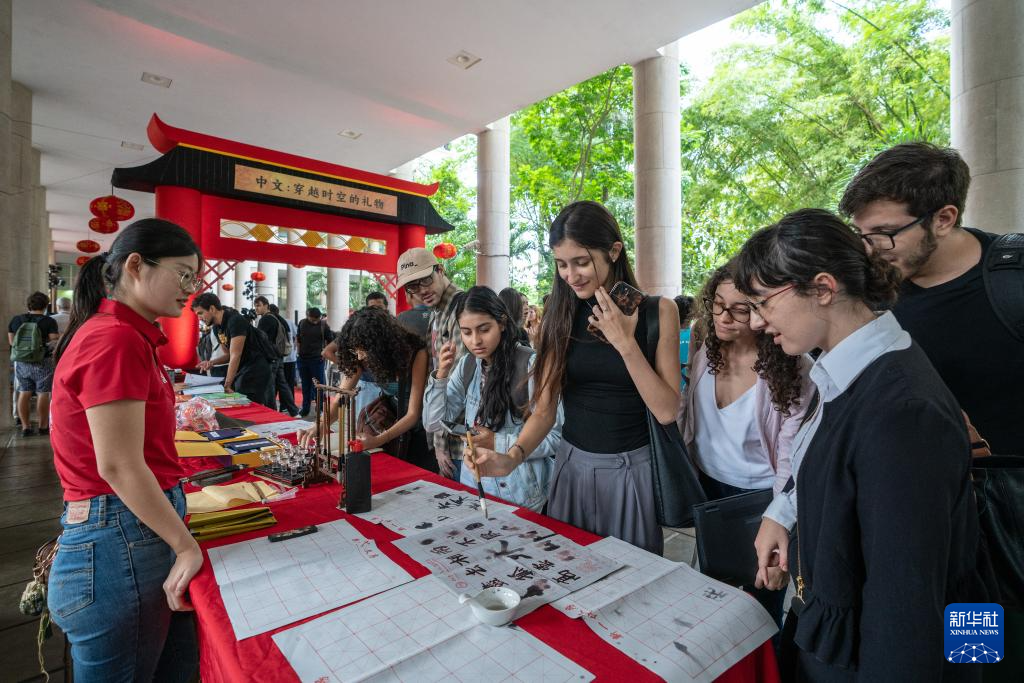 4月15日,在巴西里约热内卢天主教大学举办的“国际中文日”庆祝活动上,学生们体验中文书法。