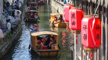 “五一”假期,不少外地游客体验了一次苏式生活:上午喝一杯早茶,中午吃一碗苏式面,下午听一曲苏州评弹,晚上坐摇橹船夜游平江河。