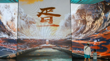 在上海历史建筑“外滩·老市府”,观众在“上海色彩”年度主题展览中拍摄雕塑作品(2025年1月9日摄)。