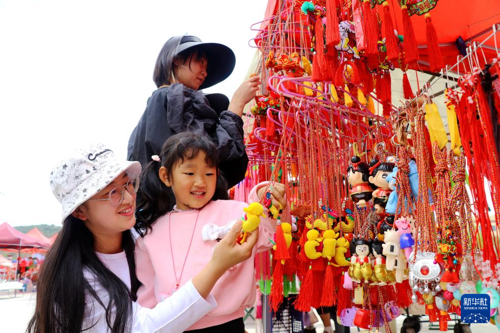 5月24日,在甘肃省平凉市静宁县成纪文化城广场,人们在选购香荷包。