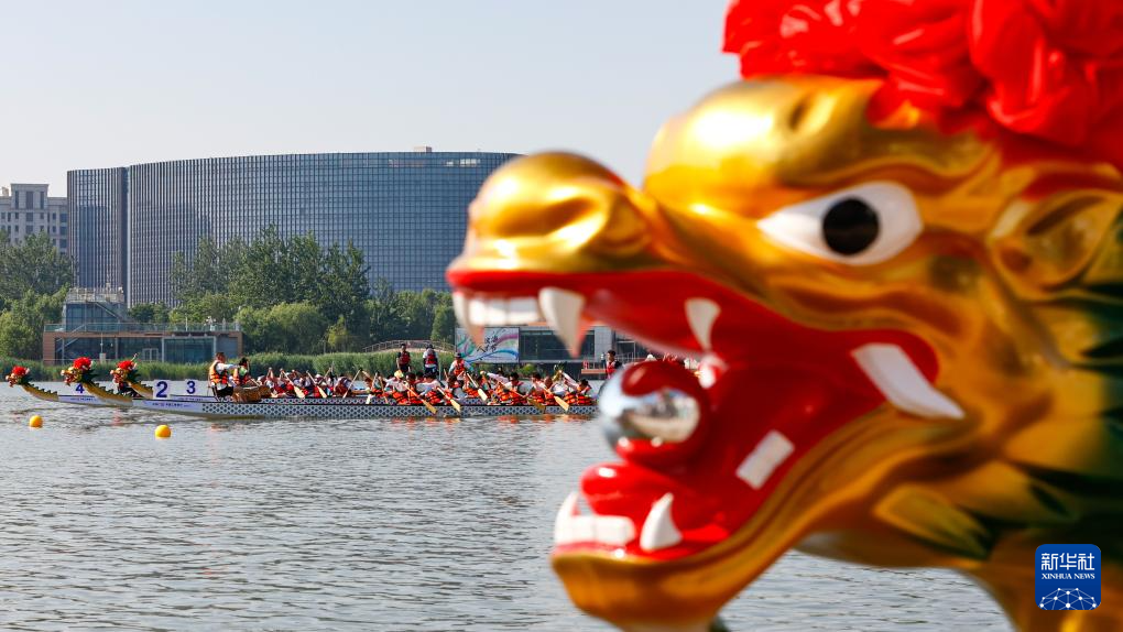 这是5月24日在天津港保税区空港西湖水域拍摄的龙舟竞渡现场。