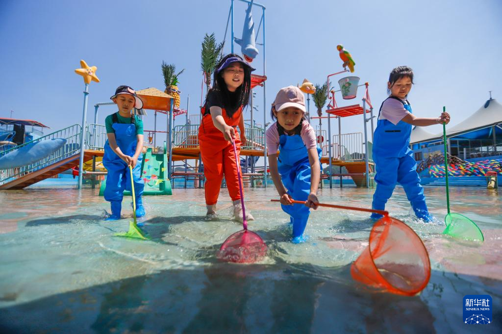 5月24日,游客在河北省遵化市南山常乐谷景区水世界参加亲子捞鱼活动。