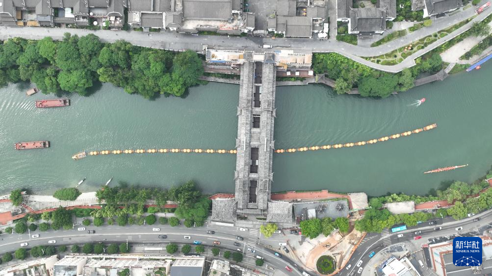 5月24日,在贵州省铜仁市碧江区锦江水域,观光龙舟从风雨桥下穿过(无人机照片)。