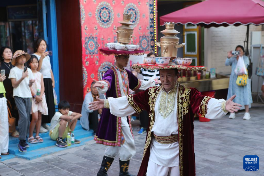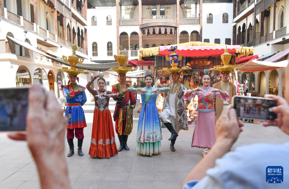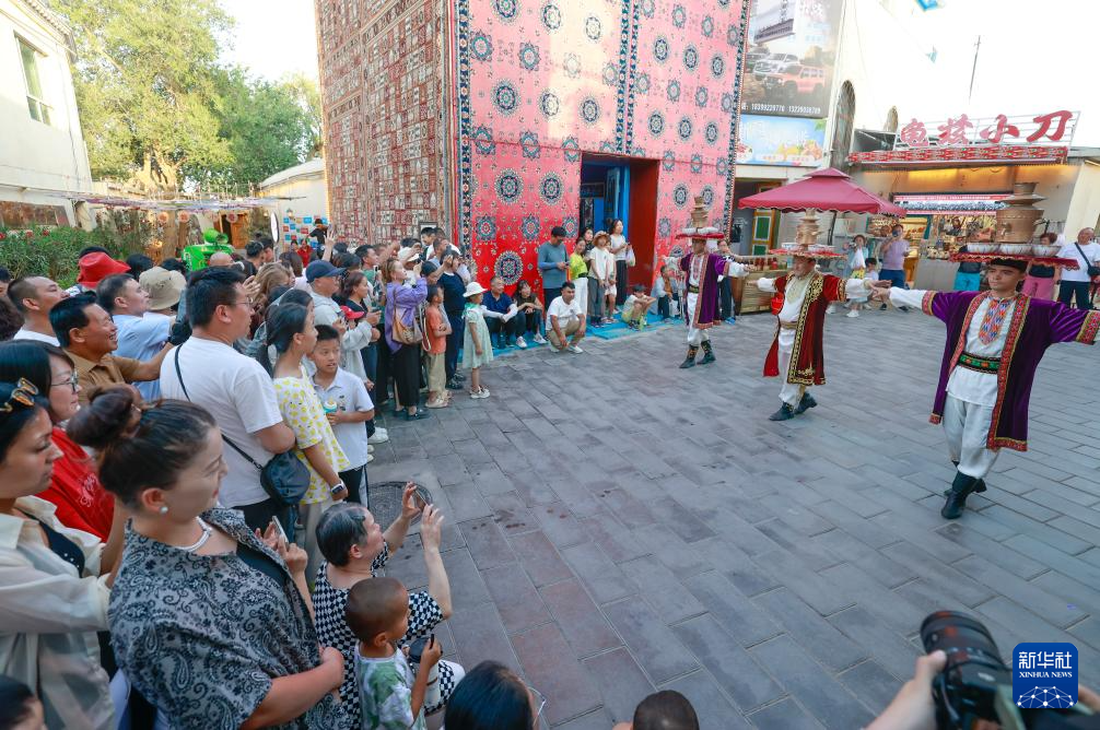 9月9日,在位于新疆乌鲁木齐的大巴扎步行街疆来城,演员在表演萨玛瓦尔舞。