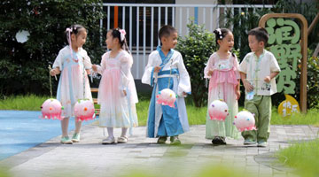 9月25日,在江苏省苏州市姑苏区平润实验幼儿园,小朋友提着自制中秋花灯欢乐游园。