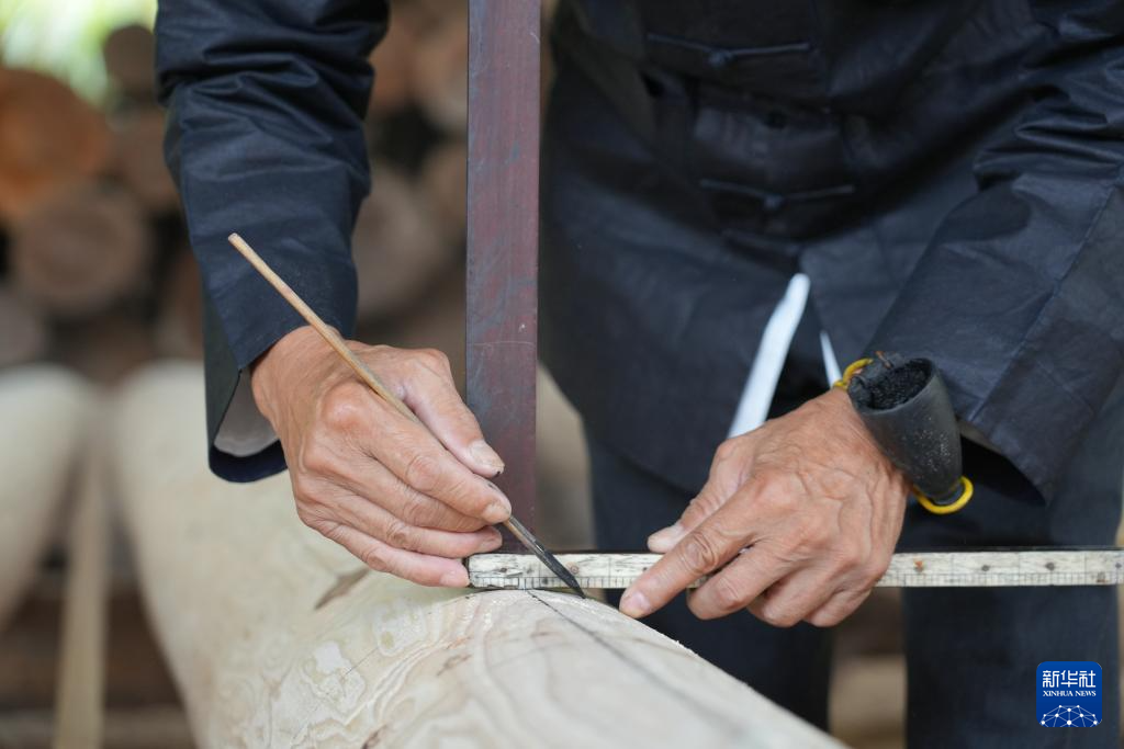 9月25日,在三江侗族自治县,杨求诗在木工车间用墨汁画出卯眼位置。今年62岁的杨求诗是国家级非物质文化遗产项目侗族木构建筑营造技艺代表性传承人,曾参与建造三江宜阳风雨桥等多座侗族风雨桥。