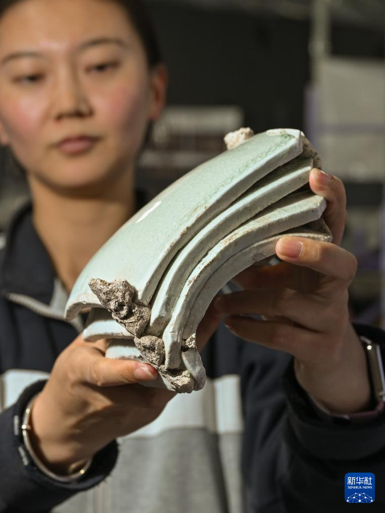 一位工作人员在苏峪口瓷窑址考古队文物库房内展示发掘出土的白瓷板瓦标本(10月13日摄)。