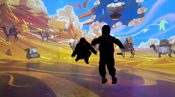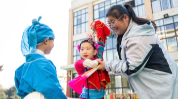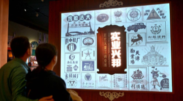 1月15日,一名游客在哈尔滨中央大街上体验弹奏“冰钢琴”。